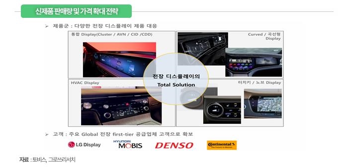 전장 디스플레이 부문 역시 실적 개선의 핵심 축으로 떠오르고 있다. LG전자 등과의 휴대폰 모듈 사업을 통해 축적한 기술력을 바탕으로 2018년 전장 디스플레이 시장에 진출했으며, 2021년 중국 대련공장과 2023년 국내 서천공장에서 본격 양산에 돌입했다. 2024년 흑자 전환에 성공한 이 부문은 고정비 분산을 통한 수익성 개선 효과가 크며, 수주 증가에 따른 영업레버리지 효과가 실현되는 구조다.