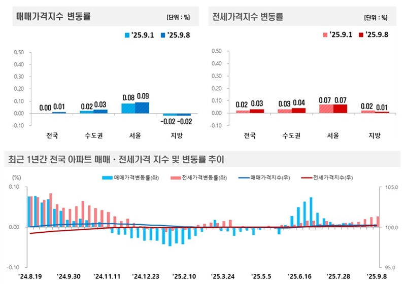 서울뿐 아니라 수도권과 지방도 전체적으로 상승 전환했다. 전국 아파트 매매가격은 전주 보합에서 이번 주 0.01% 상승으로 전환됐고, 전셋값도 0.03% 오르며 전주(0.02%) 대비 상승폭이 확대됐다.