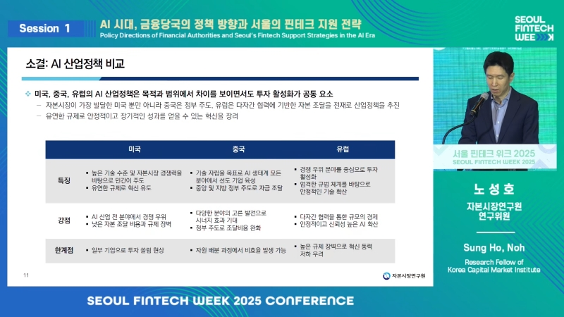 (국가별 AI 산업정책을 비교하는 노성호 자본시장연구원 연구위원,사진=서울시 유튜브 캡쳐)