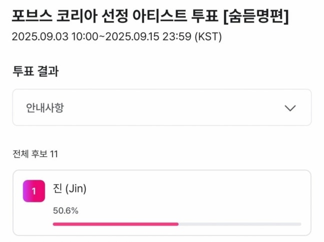 방탄소년단(BTS) 진이 포브스 코리아와 엠넷플러스가 공동 진행한 '숨겨진 명곡 맛집 아티스트' 투표에서 우승했다.