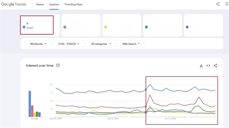 구글 트렌드(Google Trends)에 따르면 뷔는 2025년 3분기에도 K팝 아티스트 최다 검색량을 기록했다. 뷔는 구글 트렌드가 집계되는 80개국의 나라에서 중동, 중앙아시아 일부 국가를 제외한 미국, 영국, 일본 등 대다수 국가인 74개국에서 최다 검색 1위를 기록하며 K팝의 대표 주자로서의 존재감을 증명했다.
