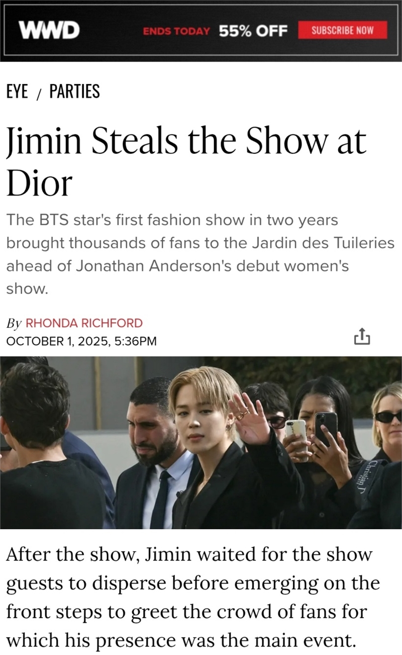 이후 패션매거진 WWD는 “지민, 디올 쇼를 스틸하다”(Jimin Steals the Show at Dior)라는 기사에서 지민이 조나단 앤더슨의 여성복 데뷔쇼를 앞두고 수천 명의 팬들을 튈르리 정원으로 끌어들였다고 소개했다. “쇼가 끝난 후 지민은 게스트들이 해산될 때까지 기다린 후 앞 계단으로 나와 팬들을 맞이했는데, 그의 존재가 메인 이벤트였다”고 전했다.