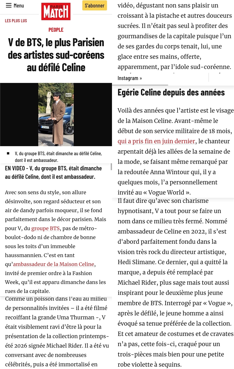 최근 뷔는 셀린느 글로벌 앰버서더로 프랑스 파리 외곽에 위치한 생클루 국립공원에서 열린 ‘셀린느 2026 여름 컬렉션’ 패션쇼에 참석했다. 프랑스 대표 인기 매거진 파리 마치는 “셀린느 쇼에서 가장 파리지앵 같은 한국 아티스트는 뷔”라는 기사에서 뷔가 이틀 동안 파리에서 남긴 깊은 인상에 대한 특별 기사를 게재했다.