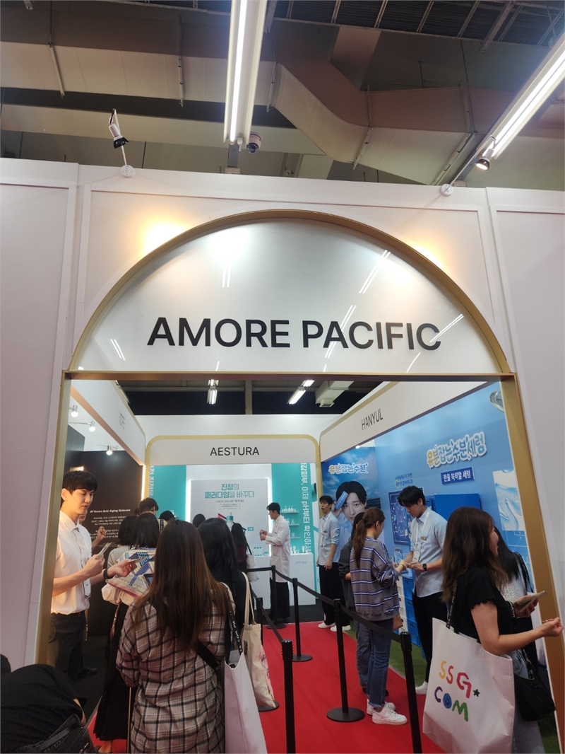 3층 ‘뷰티 오브 쓱(SSG)’ 존 내 아모레퍼시픽 체험존 앞에서 관람객들이 체험을 기다리며 줄을 서 있다. (사진=내미림 기자)
