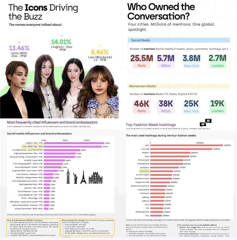 글로벌 미디어 분석 기관 ‘온클루시브(Onclusive)’가 공개한 데이터 따르면, 올해 9월 8일부터 10월 8일까지 전 세계 4대 패션위크 관련 보도와 SNS 데이터를 분석한 결과, 지민이 전체 미디어 점유율(SOV, Share Of Voice) 13.46%로 K팝 아티스트 1위를 차지했다.