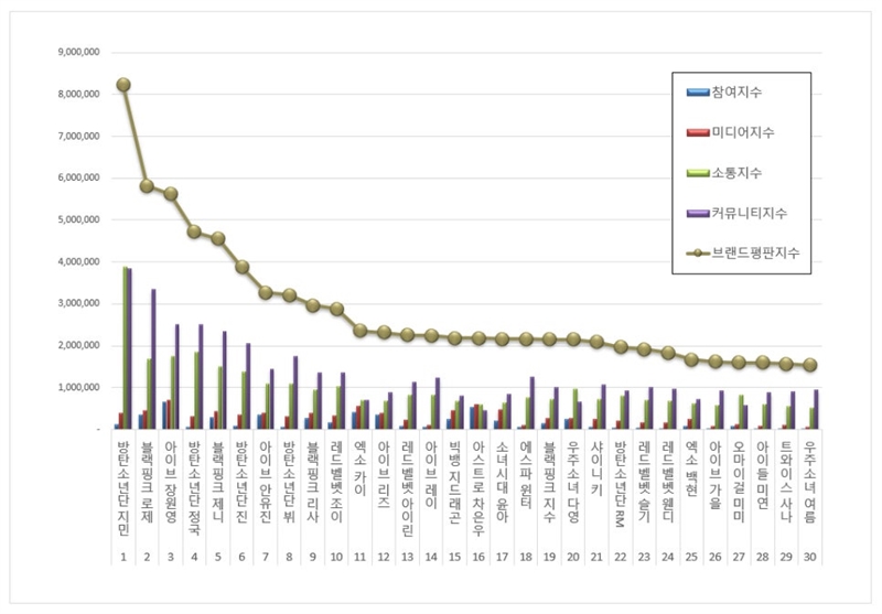 아이돌 개인 브랜드평판 1위를 기록한 지민 브랜드는 참여지수 11만 5278, 미디어지수 39만 2400, 소통지수 387만 9866, 커뮤니티지수 384만 2904가 되면서 브랜드평판지수 823만 450으로 분석됐다. 지난 9월 대비 48.65% 상승한 수치다.