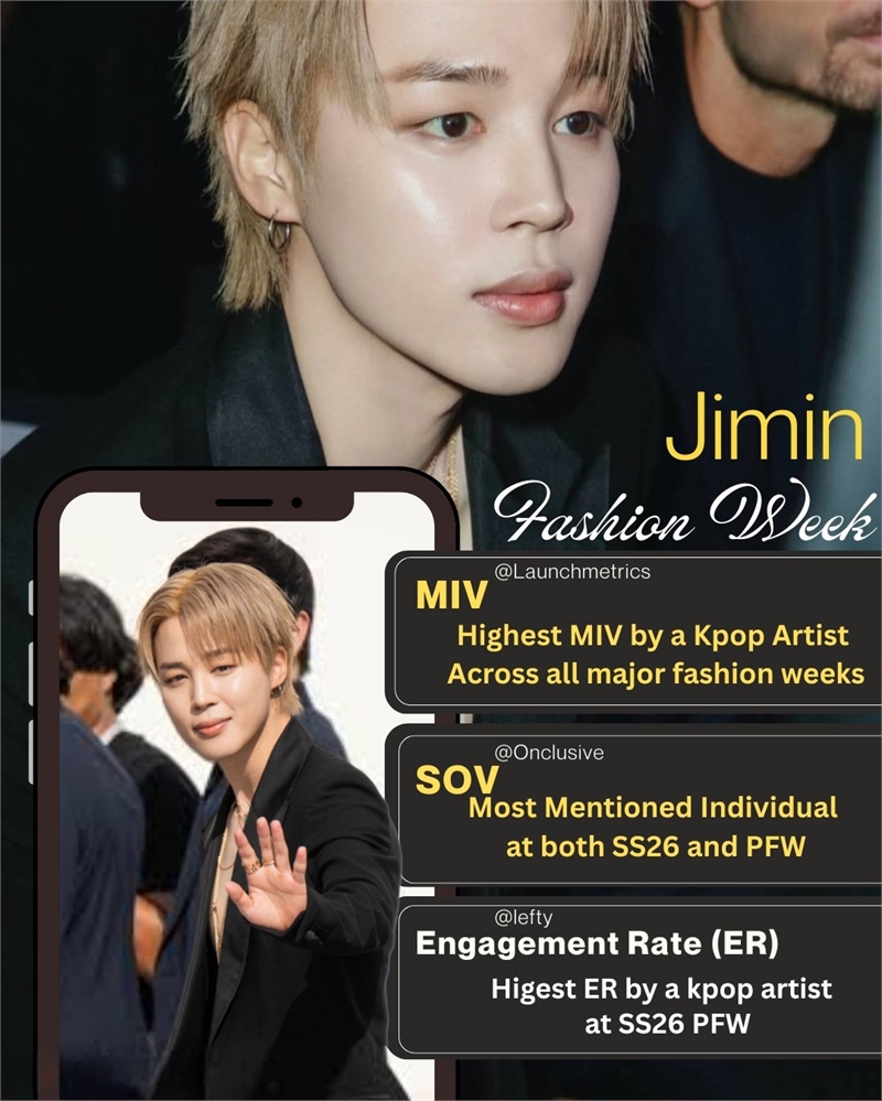 글로벌 패션 데이터 분석 기관 ‘런치메트릭스(Launchmetrics)’에 따르면, 지민은 디올(Dior) 컬렉션 참석만으로 디올 전체 MIV의 약 18%를 기여했다. 이는 파리 패션위크 10위권 브랜드 전체 MIV보다 높은 수치로, 지민의 영향력이 패션계에 미친 파급력을 명확히 보여준다.