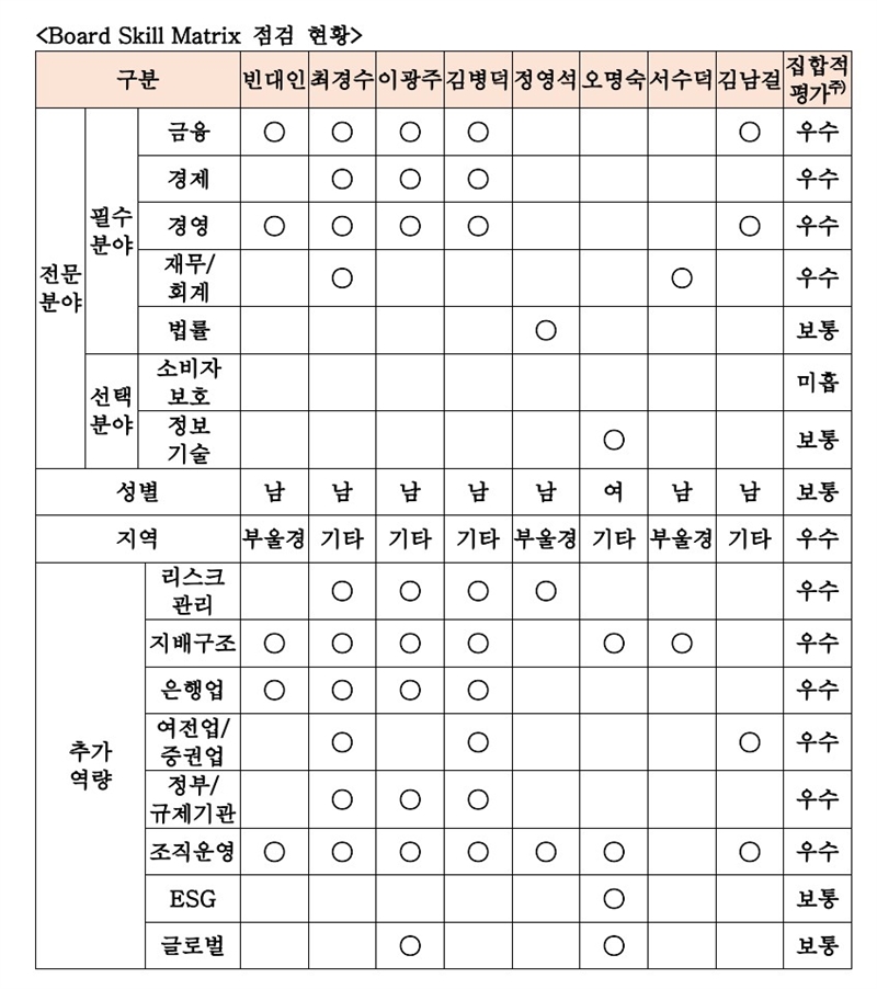 그중에서도 이광주 의장의 의중과 입김이 강하게 작용할 수밖에 없는 인적 구성이다. 정영석 위원장은 BNK금융 지배구조 연차보고서에 제시된 ‘스킬 매트릭스’ 상 금융·경제·경영·재무회계·법률 5대 필수 역량 가운데 법률 항목에만 체크가 돼 있다. 반면, 이광주 의장은 금융회사 경영의 핵심 역량인 금융·경제·경영 3개 항목에 체크가 돼 스킬의 범위가 넓다.