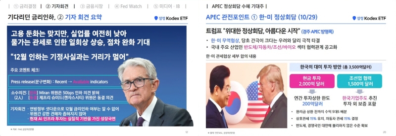 아시아태평양경제협력체(APEC) 정상회담이 금융시장에 미치는 영향과 관련해서는 한·미, 미·중 간 긴장이 해소되며 불확실성 줄어들었다고 봤다. 이동후 ETF컨설팅팀 수석매니저는 한·미 관세협상에 대해 "대미투자 방안이 연간 200억달러 상한, 투자 외 보증 포함 등 세부 합의가 이뤄지며 현금 부담이 줄었다"고 설명했다.