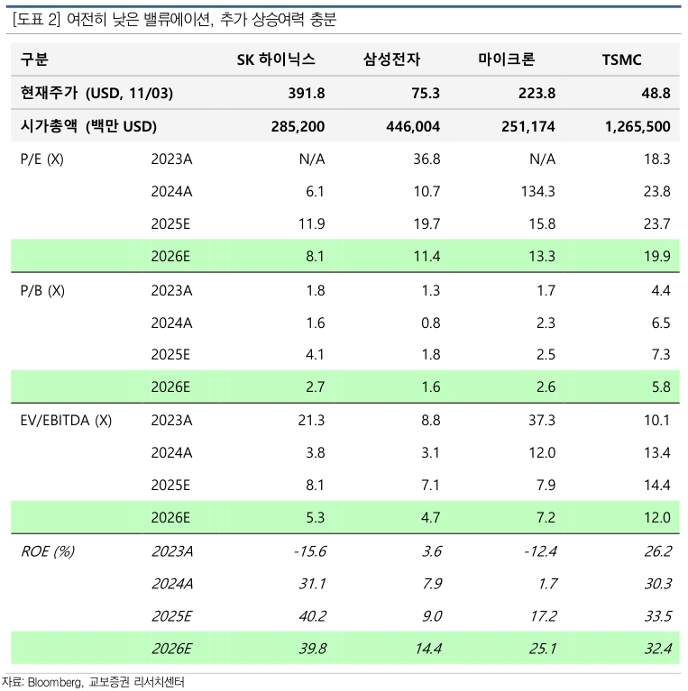 최 애널리스트는 "SK하이닉스는 가파른 주당순이익(EPS) 성장에도 불구하고 2026년 예상 주가수익비율(PER) 기준으로 삼성전자(11.4배), 마이크론(13.3배) 대비 현저히 낮은 수준(8.1배)"이라며 "글로벌 메모리 1위 기업이라는 위상, 고객사와의 협업 확대 및 장기 물량 확보 가능성을 고려하면 단순 메모리 업체가 아닌 TSMC와 유사한 밸류에이션을 적용할 여지가 충분하다"고 설명했다.