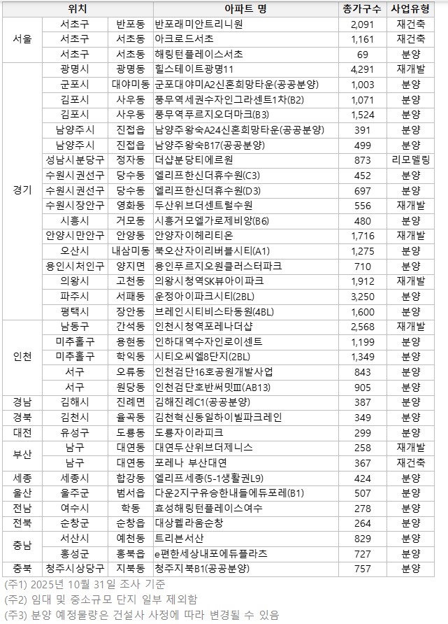 2025년 11월 전국 시도별 주요 분양 예정 단지 (자료=부동산R114)
