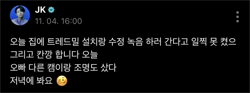 최근 정국은 글로벌 팬 커뮤니티 위버스에 "오늘 집에 트레드밀 설치랑 수정 녹음 하러 간다고 일찍 못 켰으. 그리고 칸깡 합니다 오늘"이라는 글을 게시했다.