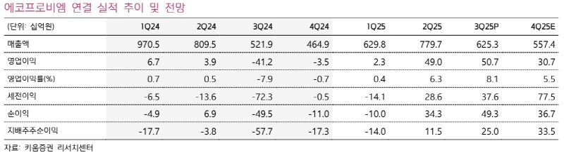 4분기 실적에 대해선 영업이익 307억원 수준을 전망했다. 권 애널리스트는 "미국 전기차 보조금 종료로 NCM 판매량 감소가 예상된다"며 "에너지저장장치(ESS) 사업부도 3분기 선제적인 출하 영향으로 4분기는 판매량이 전분기 대비 감소할 것으로 보이나 일회성 이익으로 흑자 기조는 유지될 것"이라고 설명했다.