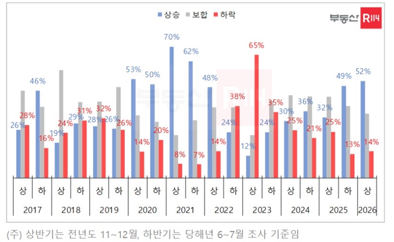 5일 부동산R114에 따르면, 전국 1458명을 대상으로 실시한 ‘2026년 상반기 주택시장 전망’ 설문조사에서 응답자의 52%가 매매가격이 오를 것이라고 답했다. 이는 2021년 하반기(62%) 이후 약 5년여 만의 최고치다.