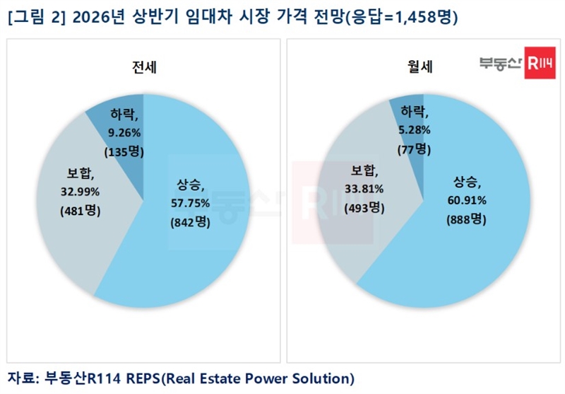 2026년 상반기 임대차 시장 가격 전망. 응답자 1458명. 상승 전망이 전세 57.75%, 월세 60.91%로 컸다. (자료=부동산R114)