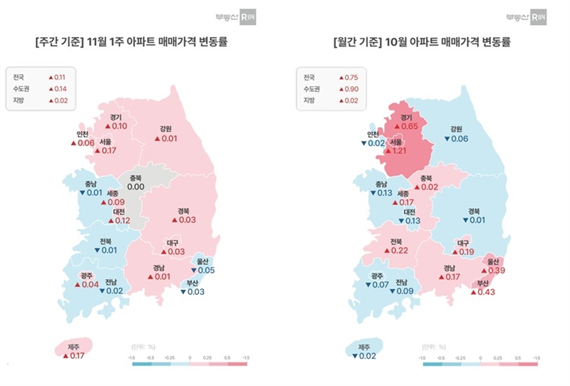 11월 1주 아파트 매매 가격 변동률 및 10월 아파트 매매가격 변동률 (자료=부동산R114)