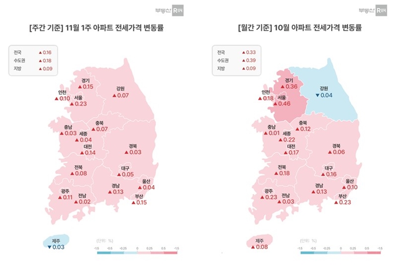 11월 1주 아파트 전세 가격 변동률 및 10월 아파트 전세가격 변동률 (자료=부동산R114)
