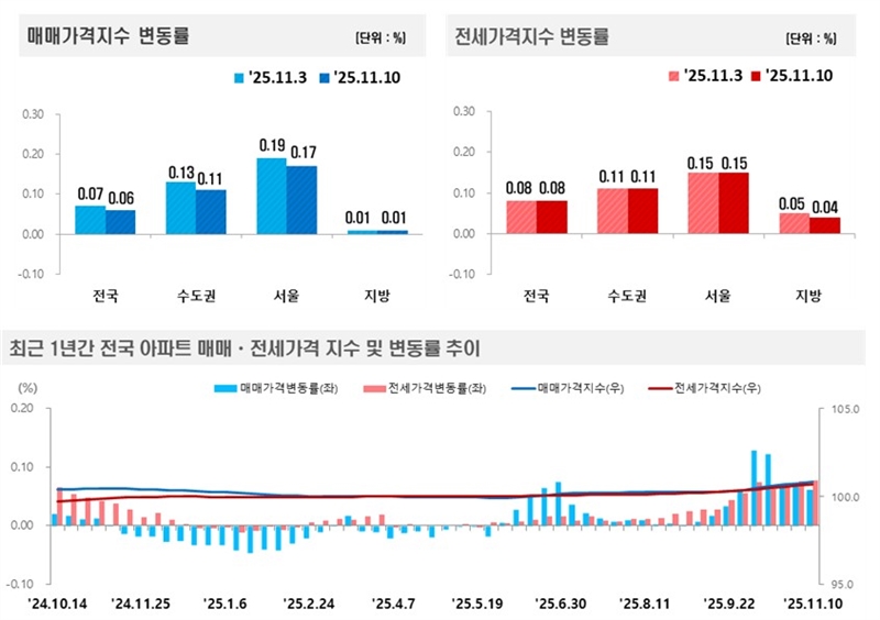 한국부동산원 발표 11월 둘째주(11월10일 기준) 주간 아파트 매매가격지수, 전세가격지수 변동률. (자료=한국부동산원)