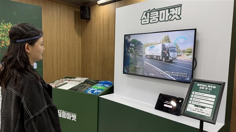 제주개발공사 팝업스토어 심쿵마켓의 뇌파 게임 코너에서 뇌파 측정기를 착용하고 영상을 관람하고 있는 방문객의 모습. (사진=제주개발공사)
