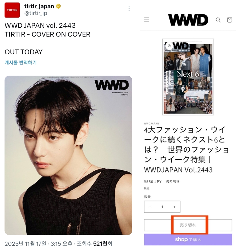 티르티르 재팬은 17일 패션, 뷰티업계 등의 정보를 전달하는 글로벌 미디어 WWD재팬에서 뷔의 티르티르 캠페인 화보가 커버를 장식한다고 발표했다. 곧이어 판매처는 품절을 알리며 뷔의 이름이 스치면 무엇이든 팔리는 '뷔 이펙트'를 입증했다.