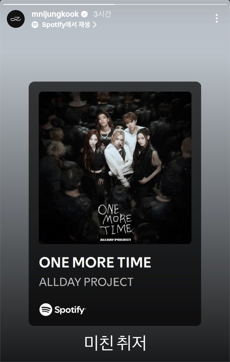 최근 정국은 자신의 인스타그램을 통해 올데이 프로젝트의 신곡 ‘원 모어 타임(ONE MORE TIME)’ 음원을 첨부하며 “미친 취저(취향 저격)”라는 글을 남겼다. 선배인 정국이 후배 그룹인 올데이 프로젝트를 샤라웃하며 응원하는 모습은 선후배 간의 훈훈한 분위기를 자아냈다.