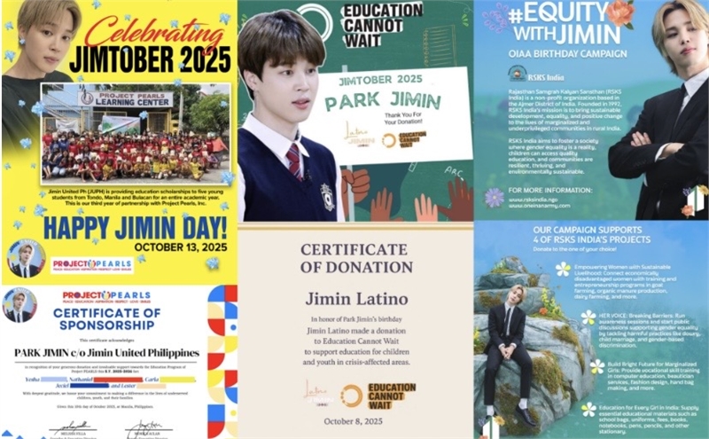 한편 지민은 모교인 부산예술고등학교를 비롯해 부산시교육청을 시작으로 전남·강원·충북·경남·전북교육청까지 각 1억 원을 지원하는 등 미래 인재 육성에 힘을 보태고 있다. 이러한 지민의 선행이 전세계 팬들에게도 이어져 각국 교육 산업에 이바지하며 귀감을 사고 있다.
