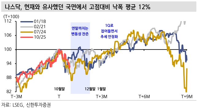 과거 기술혁신 강세장의 경험을 고려해 내년 초 상승 전환할 것이라 예상했다. 노 애널리스트는 "이번 AI 강세장은 기술혁신 사이클 출현에 기술주 주도로 시장이 상승했다는 특성과 주가 궤적이 대부분 일치한다는 점에서 닷컴, FANG(페이스북·애플·넷플릭스·구글) 강세장과 유사하다"며 "과거 패턴을 참고할 경우 주가 조정이 마무리되고 상승 추세로 전환되는 시점은 내년 초"라고 분석했다.