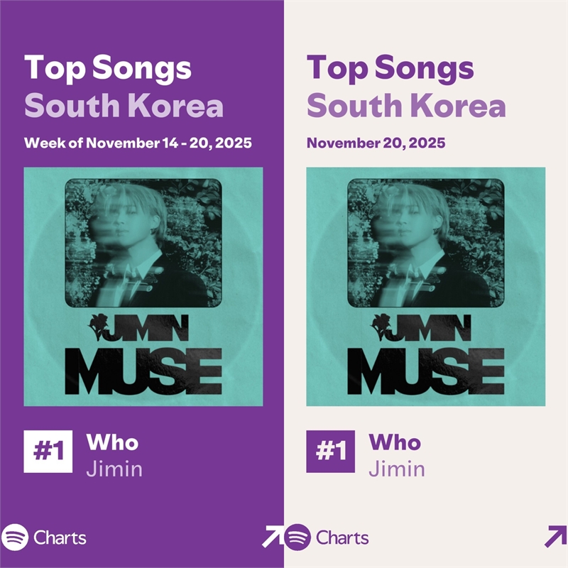 세계 최대 음원 플랫폼 스포티파이 차트에 따르면, 지민의 2집 솔로앨범 'MUSE'(뮤즈) 타이틀곡 'Who'(후)는 스포티파이 한국 '위클리 톱 송' 차트에서 65주째 1위에 올랐다. 이는 해당 차트 역사상 최초, 유일 기록이자 최다 1위 기록이다.