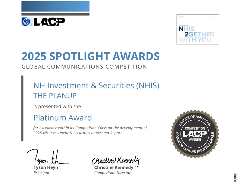 NH투자증권(대표이사 윤병운)은 당사 「2025 지속가능통합보고서」가 미국커뮤니케이션연맹(LACP, League of American Communication Professionals)이 주관하는 ‘2025 LACP 스포트라이트 어워즈(2025 LACP Spotlight Awards)’에서 대상(Platinum)을 수상했다고 25일 밝혔다.