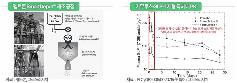 펩트론의 SmartDepot은 미립구 기반의 약효 지속 플랫폼으로, 약물의 혈중 농도를 안정적으로 유지시켜 부작용을 줄이고 투여 간격을 넓힐 수 있는 기술이다. 이 플랫폼은 LG화학과 공동으로 상업화한 전립선암·성조숙증 치료제 LeupONE에 적용돼, 이미 시장에서 실제 허가와 생산 경험을 갖췄다는 점이 강점으로 꼽힌다.