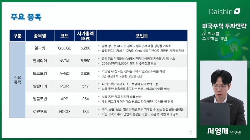 대신증권은 AI 관련 주요 종목으로 ▲알파벳 ▲엔비디아 ▲브로드컴 ▲팔란티어 ▲앱플로빈 ▲로빈후드를 제시했다.