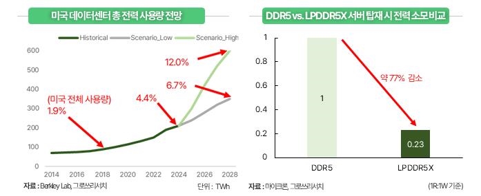 빅테크 기업들이 LPDDR을 선택한 이유는 단순하다. AI 서버의 전력 소모는 랙당 30~100kW 수준으로 기존 인프라가 감당하지 못하는 상황에 처했다. LPDDR5X는 DDR5 대비 전력 소모를 75% 절감하면서도, 대역폭은 36% 높고 레이턴시도 낮다. 이는 고효율과 고성능을 동시에 만족시킬 수 있는 유일한 대안으로 자리매김하게 만든 배경이다.