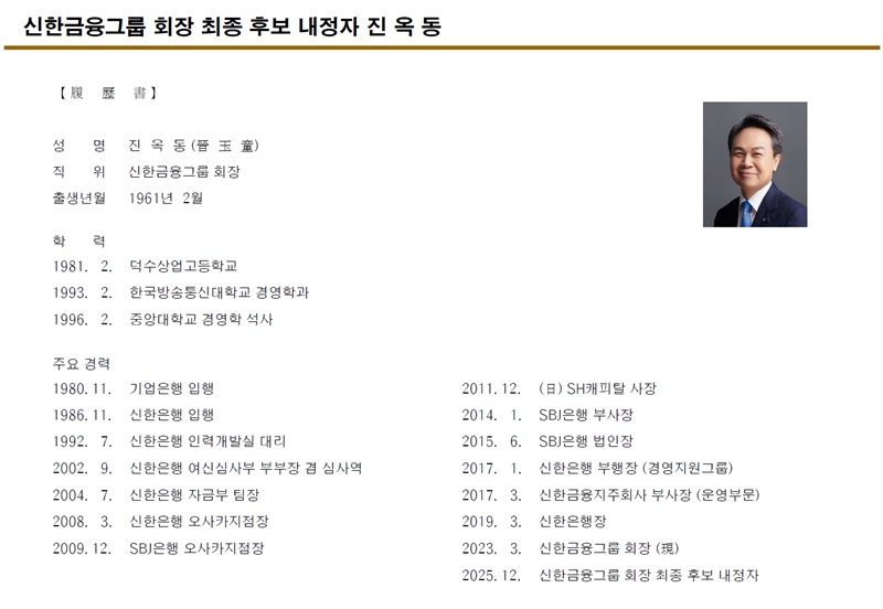 최종 후보로 추천된 진옥동 회장은 내년 3월 정기 주주총회 및 이사회의 승인을 거쳐 회장으로 취임할 예정이다.