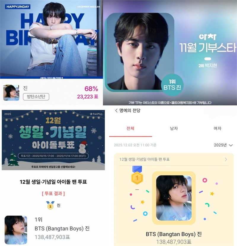글로벌 슈퍼스타 진은 투표와 기부 두 부문에서 모두 두각을 나타내며 독보적인 인기와 존재감을 입증했다. 그의 생일을 축하하는 전 세계 팬들의 마음으로 뜻깊은 'HAPPY JINDAY'를 맞이했다.