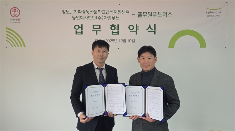 풀무원 계열 식자재 유통기업 풀무원푸드머스(대표 천영훈)는 청도군 친환경농산물 학교급식지원센터(센터장 서권환)와 지역 농산물 유통 활성화를 위한 업무협약을 체결했다고 11일 밝혔다. 청도군은 우수하고 안전한 친환경 농축산물 공급으로 학교 급식 품질 강화를 실현하고자 공공급식 위탁 사업 방식으로 ‘친환경 학교급식지원센터 지정’ 제도를 운영하고 있다. 현재는 농업회사법인 ㈜아임푸드(대표 서권환)가 청도군 친환경농산물 학교급식지원센터로 지정돼, 청도군 학교 급식 질 향상에 기여하고 있다.