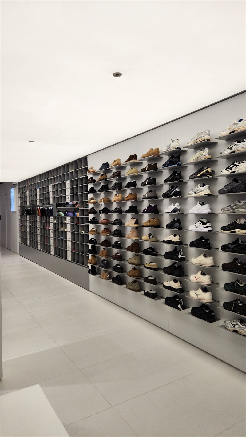 무신사 메가스토어의 '슈즈월' 스니커즈 존. 인기 브랜드 신발을 한눈에 비교·체험할 수 있도록 벽면 전체에 전시되어 있다. (사진=내미림 기자)