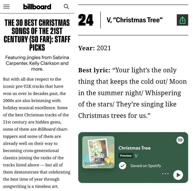 뷔의 ‘크리스마스트리’는 작년 19위에 이어 올해도 24위를 기록하며 ‘21세기 최고의 크리스마스 송 30’에 K팝 중 유일하게 이름을 올렸다. 빌보드는 “매년 연말연시의 최고 즐거움은 음악이라고 굳게 믿고 있다. 빙 크로스비의 ‘White Christmas’, 브렌다 리의 ‘Rockin' Around The Christmas Tree’ 같은 명곡을 빼놓을 수 없다”고 설명했다.