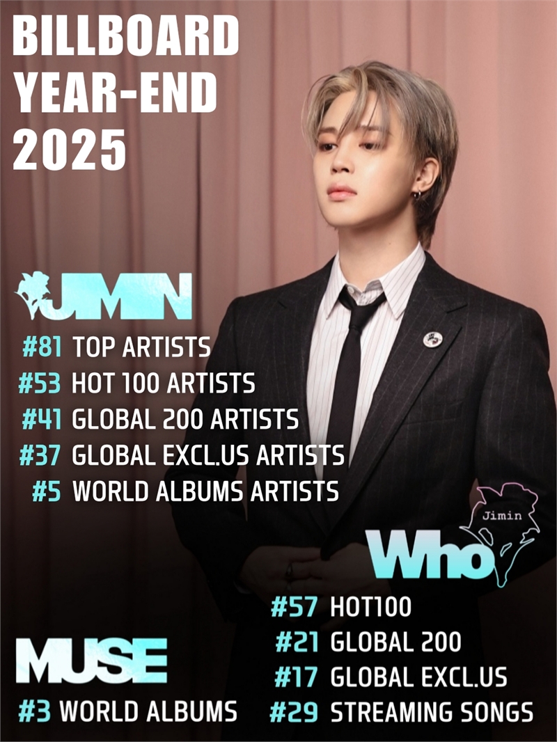지민은 'Who'로 K팝 가수 중 유일하게 2024 빌보드 결산 차트 '스트리밍 송'(74위)에 차트인 한데 이어, 2025년에는 29위에 올라 2년 연속 진입 기록을 세웠다. 'Who'는 2025 빌보드 연말결산 '글로벌 200'에서 21위, '글로벌(미국 제외)' 17위에 오르며 글로벌 파급력을 입증했다. 2024년 해당 차트에서 각각 106위, 99위에 오르며 2년 연속 차트인했다.