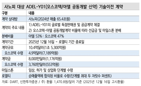 이에 오스코텍과 아델은 '아델-Y01'에 대한 전 세계 독점적 개발 및 상업화 권리를 이전한다. 사노피는 아델-Y01의 남은 임상 개발과 허가, 생산 및 상업화를 전적으로 담당한다. 이번 계약은 최대 10억4000만 달러(약 1.5조원) 규모로 오스코텍과 아델은 선급금으로 8000만달러(약 1176억원)를 수령할 예정이다. 공동개발사 아델이 기술료 수익(계약금, 마일스톤, 로열티) 수령 후 47%를 오스코텍에 분배하는 구조다.