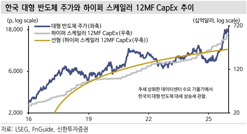 노 애널리스트는 국내 증시를 판단할 핵심 변수로 빅테크 CapEx의 절대 수준 유지 여부, 국내 반도체 업체의 HBM 확대가 가격 효과를 넘어 물량, 비트그로스(Bit Growth)로 이어지는지 여부, 외국인 베타를 여는 환율과 변동성 흐름을 꼽았다. 그는 "빅테크 CapEx 증가율 둔화보다 투자 총액 유지 여부가 중요하다"며 "삼성전자·SK하이닉스의 실적 자체 보다 가이던스가 주가에 미치는 영향력이 클 것"이라 분석했다.