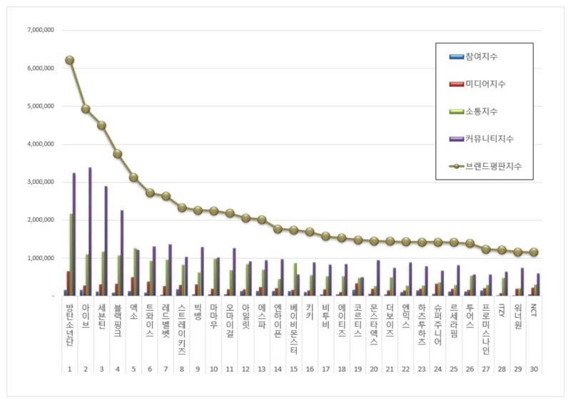 아이돌그룹 브랜드평판 1위를 기록한 방탄소년단(RM, 진, 슈가, 제이홉, 지민, 뷔, 정국) 브랜드는 참여지수 16만 3464, 미디어지수 65만 4643, 소통지수 216만 8650, 커뮤니티지수 323만 5209가 되면서 브랜드평판지수 622만 1966으로 분석됐다.