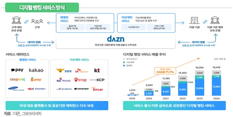더즌은 온라인 쇼핑몰·핀테크 플랫폼·카드사·보험사 등 이용기관을 대상으로 은행 전산망과 직접 연동해 이체·수납을 자동화하는 사업 구조를 갖췄다. 펌뱅킹은 플랫폼이 간편송금·결제 같은 기능을 구현하는 과정에서 사실상 필수 인프라로 작동하며, 다수 은행 전산망과의 상시 연결·운영·장애 대응 노하우가 진입장벽으로 작용한다.