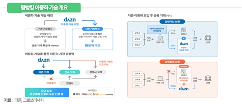 핵심 차별점은 ‘펌뱅킹 이중화’다. 더즌은 2019년 국내 최초로 펌뱅킹 이중화 기술을 도입했고, 듀얼 벤더 체계로 평시 트래픽을 분산 처리한 뒤 장애 발생 시 즉시 우회·흡수해 24시간 거래 연속성을 확보하는 방식으로 운영한다. 대형 인터넷 장애 사례가 반복된 이후 모바일 핀테크 환경에서 ‘무중단’ 안정성이 핵심 요구로 부각되면서, 이중화 역량이 레퍼런스와 추가 대형 고객 확장의 기반으로 연결되는 흐름도 나타났다.