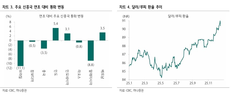 여기에 환율 악재도 부각됐다. 대규모 외국인 자금 이탈로 인해 인도 루피화는 달러당 90루피를 상회하는 수준까지 약세가 심화됐다. 그 결과 루피화는 주요 신흥국 통화 가운데서도 가장 큰 절하 폭을 기록했고, 환율 변동성 확대에 따른 환손실 우려가 부각되며 외국인 역시 인도 증시에 대한 진입 장벽이 한층 높아지는 악순환이 생겼다.