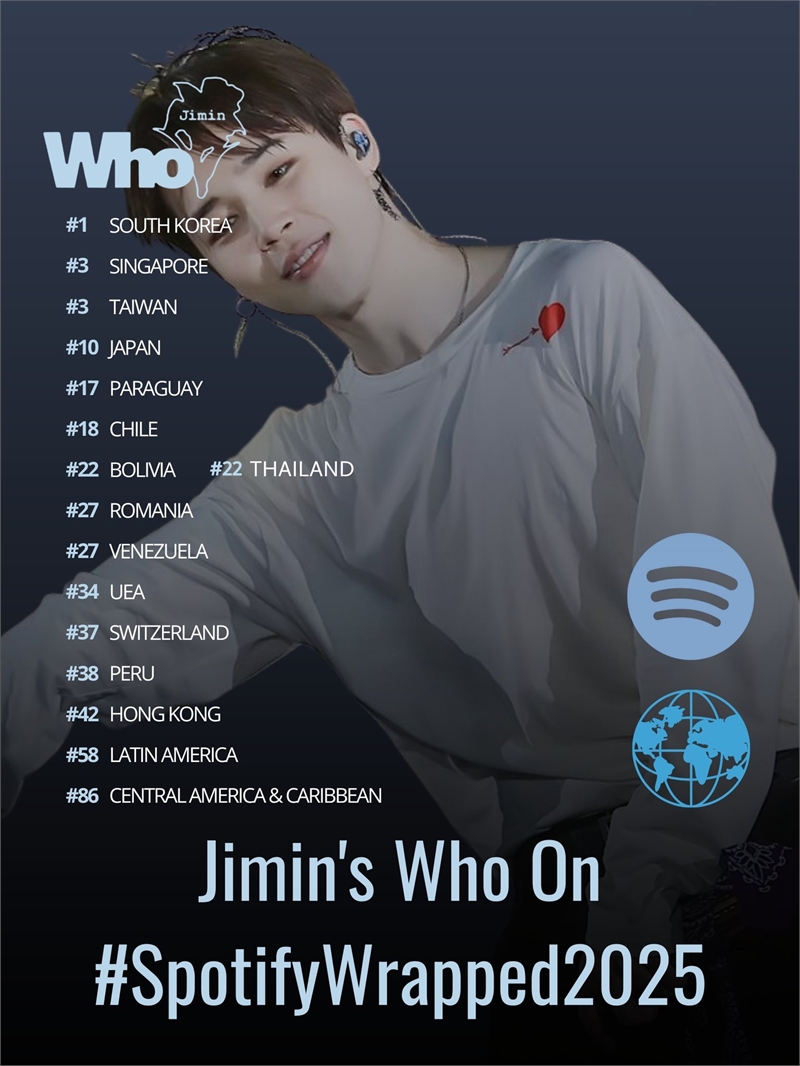세계 최대 음원 스트리밍 플랫폼 스포티파이가 발표한 '2025 랩드(Wrapped) 연말 결산' 캠페인에 따르면, 지민의 2집 'MUSE'(뮤즈) 타이틀곡 'Who'(후)가 [Top Tracks of 2025 Global] 리스트 26번째에 이름을 올렸다.