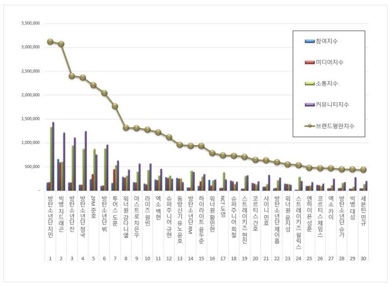 보이그룹 개인 브랜드평판 1위를 기록한 방탄소년단 지민 브랜드는 참여지수 17만 3824, 미디어지수 17만 5595, 소통지수 133만 3089, 커뮤니티지수 143만 8015가 되면서 브랜드평판지수 312만 523으로 분석됐다.