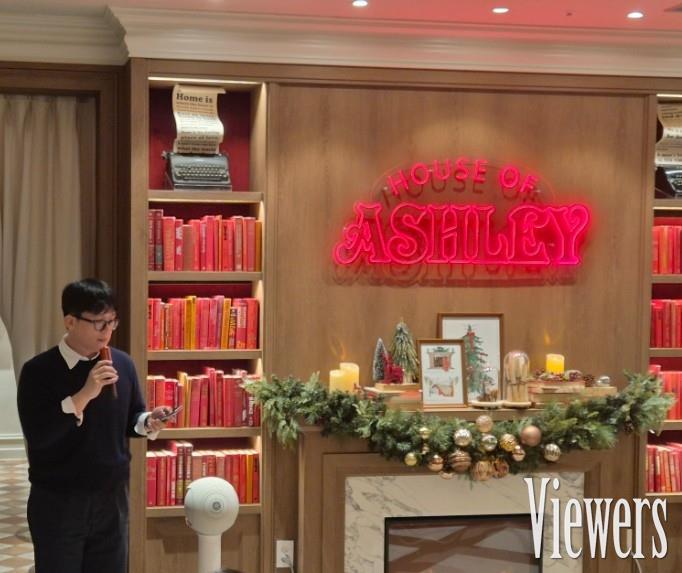 임희조 애슐리퀸즈 마케팅 총괄 실장이 지난 19일 서울 성수동에서 열린 애슐리퀸즈 팝업스토어 ‘하우스 오브 애슐리(House of Ashley)’ 미디어 프리오픈 행사에서 관계자가 전시 콘셉트와 브랜드 세계관을 소개하고 있다. (사진=내미림 기자)