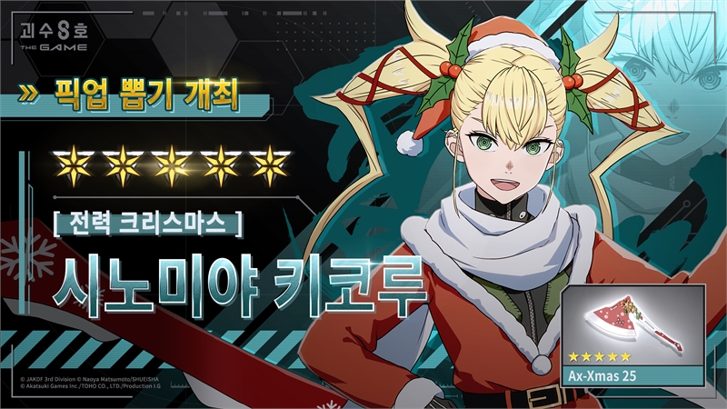아카츠키 게임즈는 토호, 프로덕션 I.G.와 공동으로 제작한 RPG '괴수 8호 THE GAME'에 신규 5성 캐릭터 '전력 크리스마스 시노미야 키코루'를 업데이트했다고 23일 밝혔다.