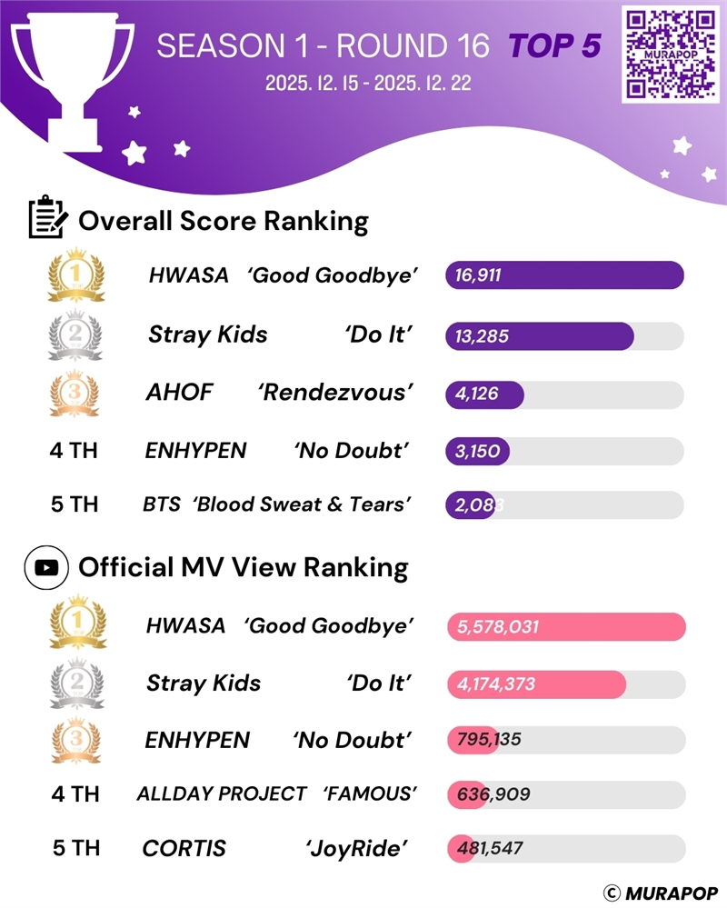 최근 뮤라팝은 12월 15일부터 12월 22일까지 진행된 뮤직비디오 라이벌매치 시즌 1-16회차 결과를 공개했다. 방탄소년단은 베이비몬스터(BABYMONSTER)와 맞대결 끝에 최종 승리했다.