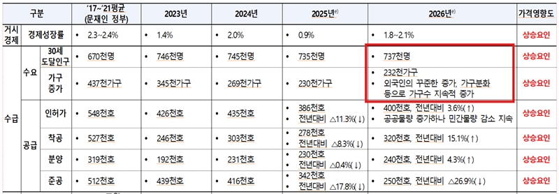 2026년 주택시장 영향 요인 일부. 30세 도달 인구는 2022년 이후 연평균 74만명 수준. (자료=주택산업연구원)